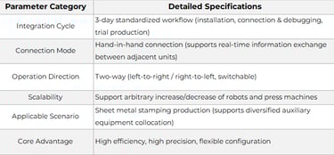 The Current-Central Robotics Integration System adheres to strict industrial standards, with stable and reliable performance parameters that fully meet the requirements of sheet metal stamping automation production. Key specification parameters are as follows: